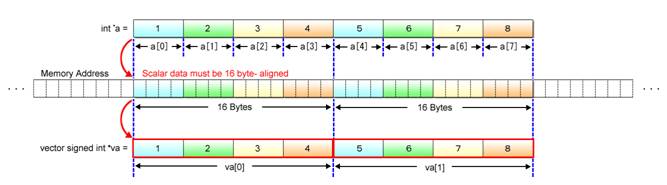Lines 12〜16 Used to define the variables necessary for SIMD operations. Variables va, vb and vc are pointers to the vector variables used in SIMD operations. These variables allow referencing to scalar arrays in an equivalent vector form.