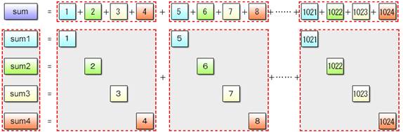The focus of discussion here is on how to divide the data and how to process it with SIMD operations. Since the data type is int, SIMD operations can handle four values at a time. Accordingly, divide the data (numbers from 1 to 1024) into four segments, calculate the partial sums for these segments and add the four partial sums together at the end.