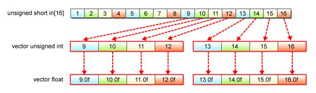 The biggest challenge here is how to change the vector data type by SIMD operations. The given data, which is unsigned short, must be converted into float data to allow floating-point calculations. With SIMD operations, this is performed by the use of the vec_ctf() function.