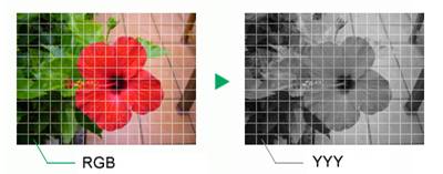 Grayscale conversion involves extraction of brightness data Y from each pixel’s RGB values to make it possible to render images composed of shades of gray. The formula used for brightness calculation is shown below.